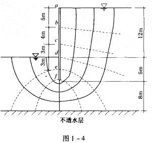 相关内容:砂土,地基,基坑,地下,水位,地面,齐平,开挖,排水,流网,如图,1-4所示,线之,水头,损失,基底,水力