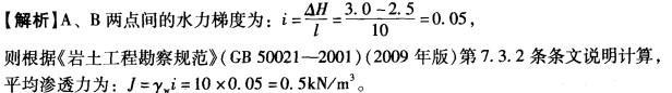 问题 某岸边工程场地细砂含水层的流线上A、B两点,A点水位标高2.5m,B点水位标高3.0m,两点间流线长度为10m,请计算两点间的平均渗透力将最接近( )kN/m3。 A. 1.25 B. 0.83 C. 0.50 D. 0.20