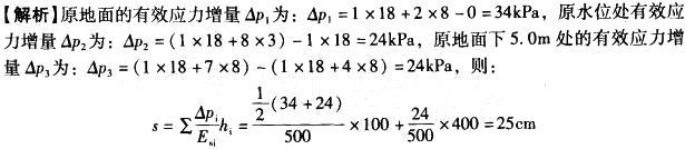 问题 某滞洪区滞洪后沉积泥砂层厚3.0m,如图1-10所示,地下水位由原地面下1.0m升至现地面下1.0m,原地面下有厚5.0m可压缩层,平均压缩模量为0.5MPa,滞洪之前沉降已经完成,为简化计算,所有土层的天然重度都以18kN/m3计,请计算由滞洪引起的原地面下沉值将最接近( )cm。 A. 51 B. 31 C. 25 D. 21