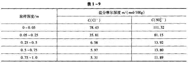 在一盐渍土地段,地表1.0m深度内分层取样,化验含盐成分如表1-9所示,按《岩土工程勘察规范》(GB 50021-2001)(2009年版)计算该深度范围...