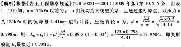 问题 某建筑场地在稍密砂层中进行浅层平板载荷试验方形压板底面积为0.5m2,压力与累积沉降量关系如表1 -13所示。变形模量E0最接近于下列( )MPa。(土的泊松比μ= 0. 33,形状系数为0.89) A. 9.8 B. 13.3 C. 15.8 D. 17.7