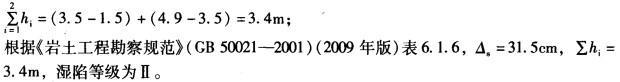 解析 根据《岩土工程勘察规范》(GB 50021-2001)(2009年版)第6. 1. 4 ~ 6. 1. 7条, 计算如下: 承压板的宽度为: 附加湿陷量与承压板宽度之比为:ΔFs1/b =4.51/50 =0.090,ΔFs2/b =4.82/50 = 0.096, ΔFs3/b = 1. 10/50 =0. 022<0. 0230。总湿陷量计算时,只计算第一层与第二层土的湿陷量,不需计入第三层土的湿陷量。 总湿陷量和土地基总厚度分别为:
