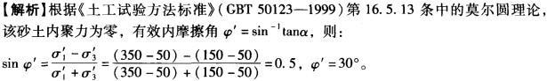 某砂土试样进行室内三轴剪切试验,围压为150kPa,破坏时的垂直压力为350kPa,同时测得孔隙水压力为50kPa,该砂土的有效内摩擦角为( )。 A....