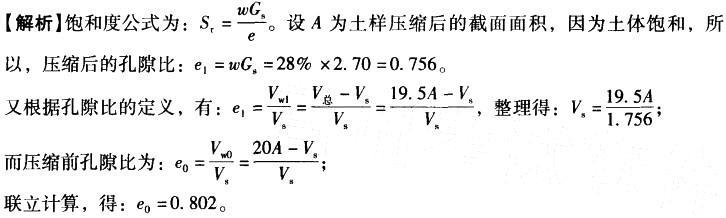 饱和土样(Sr= 1)的比重Gs= 2.70,高度为20mm,压缩后的含水率w=28%,高度为19.5mm。则压缩前的孔隙比e0为( )。 A. 0. ...