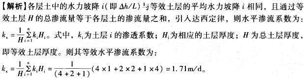 不透水基岩上有水平分布的三层土,其厚度分别为4m、2m和1m,其水平向的渗透系数分别为1m/d,2m/d和4m/d。其等效水平渗流系数为( )m/d。 ...