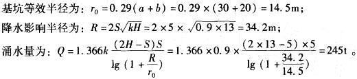 问题 某基坑长30m,宽20m,场地中自0~ 15m为砂层,渗透系数为0.9m/d,地下水埋深为2.0m,要求基坑水位降至地表以下7.0m,基坑远离地表水体及隔水边界,抽水井深15m,自2.0m以下为过滤器,根据《建筑基坑支护技术规程》(JGJ 120—1999),该基坑涌水量最接近于( )t。 A. 200 B. 219 C. 300 D. 345