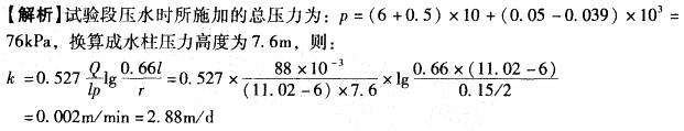问题 压水试验的压力表读数为0.05MPa,高于地表0.5m,压入流量=88L/min,试验段深度6.0m至11. 02m,地下水位埋深8. 5m,钻杆及接头的压力损失均为0. 039MPa,钻孔直径150mm,则岩体的渗透系数k为( )m/d。 A. 1. 18 B. 1.38 C. 2.56 D. 2. 88
