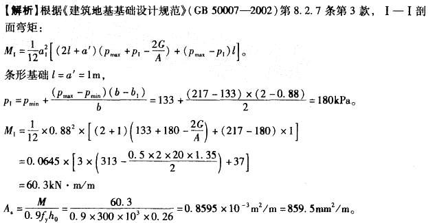问题 如图3 - 10所示的条形基础宽度b= 2m,b1= 0.88m,h0 = 260mm,pmax=217kPa, pmin = 133kPa,基础埋深0.5m,As=M/0.9fyh0。计算每延米基础的受力钢筋截面面积最接近于下列哪个选项?(钢筋抗拉强度设计值fy =300MPa) ( ) A. 1030mm2/m B. 860mm2/m C. 1230mm2/m D. 1330mm2/m
