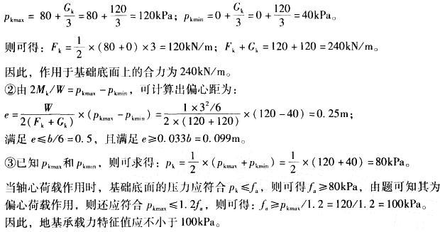 解析 根据《建筑地基基础设计规范》(GB 50007—2002)第5. 2. 1 ~ 5. 2. 5条计算如下:①由题可知,Gk= bldyd = 3×1×2×20= 120kN/m,则有:
