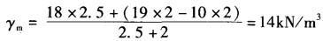 解析 根据《建筑地基基础设计规范》(GB 50007—2002)规定对地基承载力特征值进行修正,规范承载力修正公式为:fa =fak+ηby(6-3) +ηdym(d-0.5)。式中,由粉土层黏粒含量ρc=13%,查表5. 2.4得ηb=0.3,ηd =1.5。y为基础底面下土的重度,地下水位以下用有效重度为:y′= ysat - yw = 19 - 10 = 9kN/m3,基础宽度b=20m>6m,按6m计算。ym为基础埋深范围内土的加权平均重度,地下水位以下用有效重度,则: 将上述结果带入公式计算: fa=fak+ηby(b-3) +ηdym(d-0.5) =175+0.3×9×(6-3) + 1. 5×14×(4. 5-0. 5) = 267.1kPa