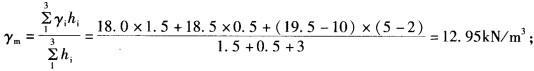 解析 根据《建筑地基基础设计规范》(GB 50007—2002)第5. 2. 4条,由于箱基宽度6 = 9m>6. 0m,按6m计算;箱基埋深为d=5m。由于持力层为黏性土,确定修正系数ηb、ηd的指标为孔隙比e和释性指数IL,它们可以根据土层条件分别求得:由于IL=0.73,e=0. 83,从査表5. 2. 4得ηb=0.3,ηd= 1.6,考虑到基础位于地下水位以下,故持力层的容重取有效浮容重为:y′= 19. 5 - 10 = 9. 5kN/m3。 而基底以上土层的加权平均容重为: 则可求得地基承载力特征值为:fa=fak+ηby′(b-3)+ηbym(b-0.5) = 190+0.3×9. 5×(6 -3) +1.6×12. 95×(5-0. 5) =292kPa。