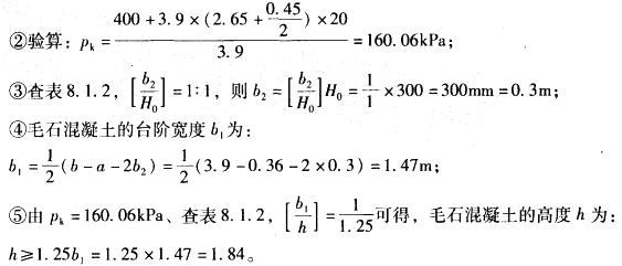 问题 已知墙下条形基础在±0.00标高处的轴力标准值F=400kN/m,埋深2.65m,室内外高差0.45m,修正后的地基承载力特征值fa =160kN/m2,基础底部采用混凝土基础,H0 = 300mm,其上采用毛石混凝土基础,墙身厚360mm。 (1)毛石混凝土高度至少应为( )m。 A. 1.74 B. 1.84 C. 1.94 D. 2.04