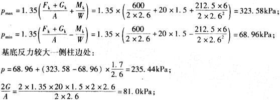 问题 某多层厂房柱子柱脚尺寸800mm×1000mm,采用无筋扩展基础按荷载效应的标准组合计算,传至±0.0处的竖向力为Fk =600kN,力矩Mk =160kN·m,水平力Hk=35kN。 基底面积为2m×2. 6m,设计基础埋深1. 5m。基础材料采用C15混凝土。 (2)基础弯矩最大截面的弯矩设计值最接近( )kN ? m。 A. 100 B. 140 C. 170 D. 190