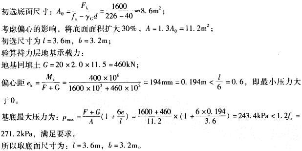 问题 拟设计独立基础埋深为2.0m,若地基承载力设计值为fa=226kPa,上部结构荷重N= 1600kN, M=400kN·m,基底处Q=5OkN,则经济合理的基底尺寸最接近于( )。 A. 3. 8m×4. 6m B. 3. 6m×3. 2m C. 2. 4m×3. 2m D. 2. 8m×2. 6m