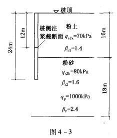 某泥浆护壁灌注桩桩径800mm,桩长24m,采用桩端桩侧联合后注浆,桩侧注浆断面位于桩顶下12m,桩周土性及后注浆桩侧阻力与桩端阻力增强系数如图4-3所示...