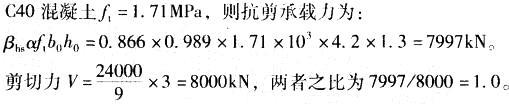 问题 如图4-8所示,竖向荷载设计值F=24000kN,承台混凝 土为C40(ft = 1.71MPa),按《建筑桩基技术规范》验算柱边A—A至桩边连线形成的斜截面的抗剪承载力与剪切力之比(抗力/V)最接近下列哪个选项?( ) A. 1.05 B. 1.2 C. 1.3 D. 1.4