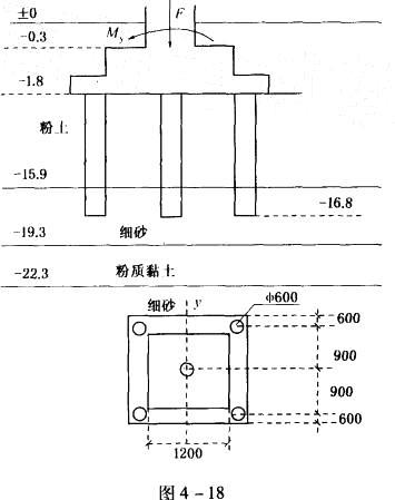 某框架柱采用桩基础,承台下5根Φ=600mm的钻孔灌注桩,桩长l=15m,如图4-18 所示,承台顶处柱竖向轴力F = 3840kN,My=161kN·m...
