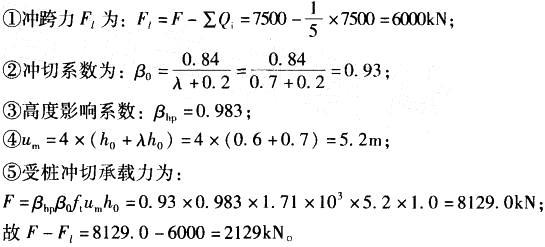 问题 某柱下桩基(y0= 1)如图4—21所示,柱宽hc=0.6m,承台有效高度h0= 1. 0m,冲跨比λ= 0. 7,承台混凝土抗拉强度设计值ft= 1. 71 MPa,作用于承台顶面的竖向力设计值 F = 7500kN,按《建筑桩基技术规范》(JGJ 94—2008)验算柱冲切承载力时,下述结论正确的是( ) 。 A.受冲切承载力比冲切力小800kN B.受冲切承载力与冲切力相等 C.受冲切承载力比冲切力大810kN D.受冲切承载力比冲切力大2129kN