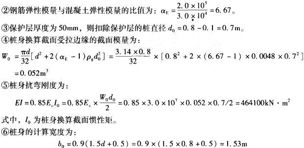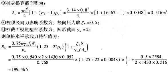 解析 根据《建筑桩基技术规范》(JGJ 94-2008)第5. 7. 2条,计算如下: ①明确水平承载力是由桩身强度控制还是由位移控制。桩身配筋率为:ρg= 12×0. 0162/0. 82 =0. 48%<0. 65% ,因此水平承载力由桩身强度控制。