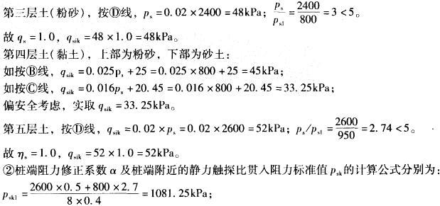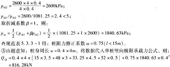 解析 根据《建筑桩基技术规范》(JGJ 94—2008)第5. 3. 3条,混凝土预制桩单桩竖向极限承载力标准值的计算公式为: Quk = Qsk +Qpk =u∑qsikli +αpskAp 式中,li为桩周第i层土的厚度。 计算过程如下: ①按规范图5.3. 3各层土极限侧阻力标准值qsik分别为: 地表下6m范围内,顶部3.5m;按图中(A)线,qsik=15kPa。