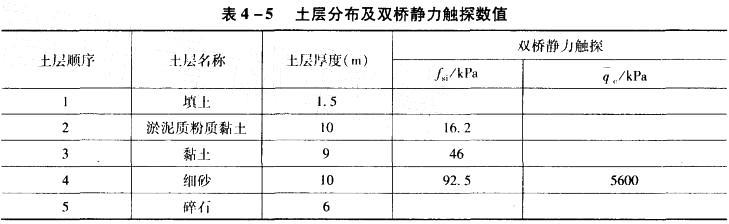 问题 某建筑场地土层的各项数据指标如表4-5所示,桩基承台埋深1.5m,.采用钢筋混凝土预制桩,桩长22m、截面尺寸为450mm×450mm,.试依据《建筑桩基技术规范》(JGJ 94-2008)推荐的经验公式计算单桩承载力。根据双桥探头静力触探试验结果计算单桩承载力,其值接近于()kN。 A. 1107 B. 1218 C. 1800 D. 2107