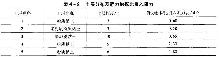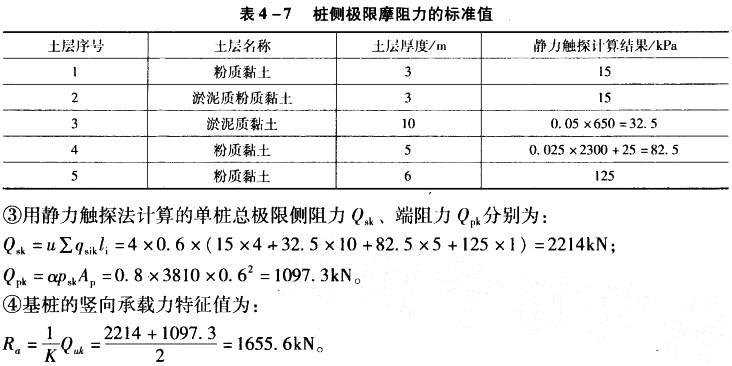 问题 有一桩基础,建筑场地土层分布见表4-6,第五层为持力层,桩尖进入持力层约1m,基桩的有效长度为20m,承台埋深2m,桩的截面尺寸为600mm×600mm。用静力触探法估算单桩承载力特征值,其大小最接近于( )kN。 A. 1657 B. 2023 C. 2600 D. 2765