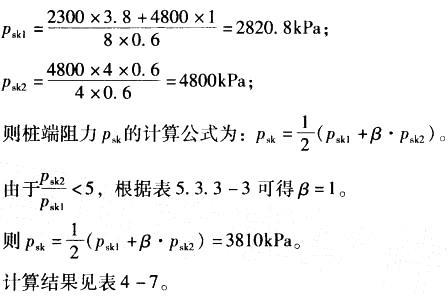 解析 根据《建筑桩基技术规范》(JGJ 94—2008)第5. 3. 3条规定计算如下: ①各层土极限侧阻力标准值qsik为: 地表下6m范围内,极限侧阻力取qsik = 15kPa。 当深度大于 6m 时,若ps<1000kPa,qsik=0.05Ps;若1000kPa<ps<4000kPa,qsik=0. 025ps +25;若ps>4000kPa,qsik= 125kPa。 ②单桩总极限侧阻力计算公式为:Qpk=αPskAp。 式中,α为桩端阻力修正系数,根据桩入土深度取α=0.8;
