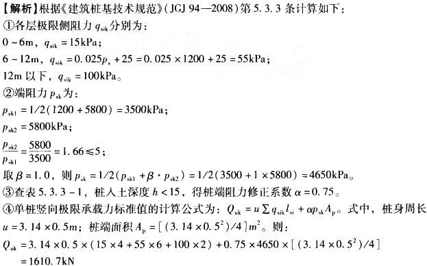 问题 某建筑场地条件为:地表以下0~12m为可塑状态黏性土,单桥静力触探比贯入阻力Ps为1200kPa;12m以下为密实粗砂,比贯入阻力为5800kPa,场地中拟采用灌注桩基础,桩长为12m,桩径为0.5m,桩顶入土深度为2.0m,根据《建筑桩基技术规范》(JGJ 94一2008)计算得单桩极限承载力标准值为( )kN。 A. 1610 B. 1660 C. 1710 D. 1760