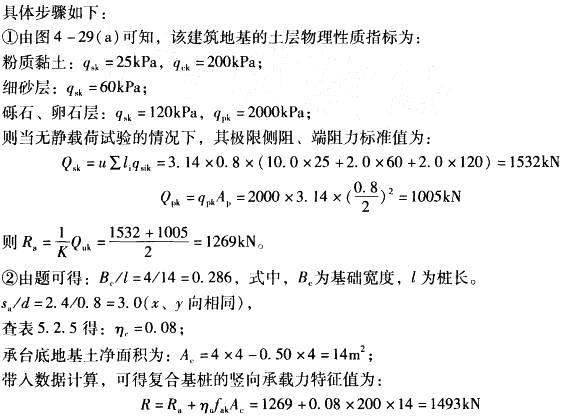 解析 根据《建筑桩基技术规范》(JGJ 94—2008)式(5.2.5 -1)计算,其复合基桩竖向承载力特征值为: R=Ra+ηGfakAc