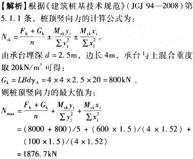 问题 有一五桩正方形承台,如图4-30所示。作用于桩基承台顶面的竖向力设计值为8000kN,平行于x轴及y轴的力矩分别为600kN·m1和100KN·m,承台埋深为2. 5m,根据《建筑桩基技术规范》(JGJ 94一2008)计算桩顶竖向力的最大值为( )kN。 A. 1710 B. 1810 C. 1876 D. 2010