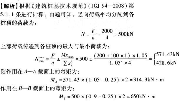 问题 已知某桩基工程,桩的平面布置及承台尺寸如图4-34 所示。平面尺寸为500mm×500mm,方柱下设4根桩,相应于荷载效应基本组合时作用于承台顶面的荷载为F=2000kN, M = 200kN·m, H= 100kN。根据《建筑桩基技术规范》(JGJ 94—2008)确定作用在承台及B—B截面上的弯矩分别为( )kN·m。 A. 914; 680 B. 914; 650 C. 900; 680 D. 900 ; 650