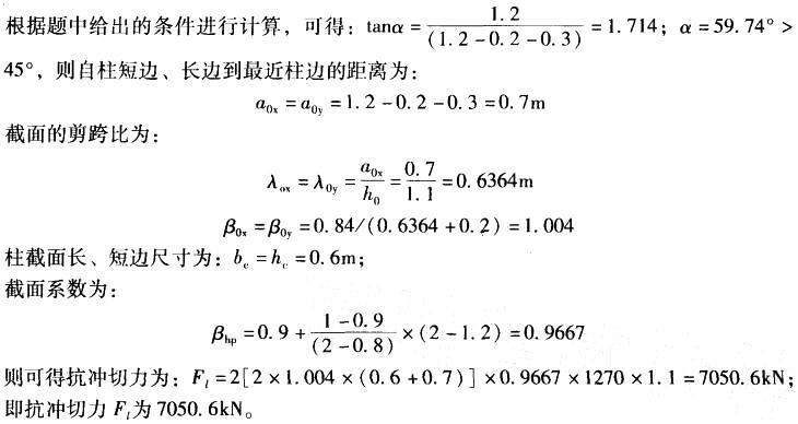 解析 根据《建筑桩基技术规范》(JGJ 94—2008)第5.9.7条规定,正方形柱下独立承 台受柱冲切的承载力计算公式为: Fl≤4β0x(hc+a0x)βhpfth0