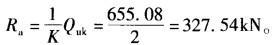 解析 根据《建筑桩基技术规范》(JGJ 94-2008)第5. 3. 5条,当根据经验关系计算单桩竖向承载力标准值时,其计算公式为: Quk=Qsk + Qpk =u∑qsikli + qpkAp 根据题中给出的条件,分别计算各项参数如下: ①桩周长为:u=0.3×4 = 1.20m; ②桩横截面积为;Ap = 0. 3×0. 3 = 0. 09m2 ; ③由以上条件可得单桩竖向极限承载力标准值为: Quk =1. 20×(2×60+26×4.4 +80×1. 55) +2500×0.09 =655.08kN 不考虑群桩效应,根据第5. 2. 2条,计算单桩竖向承载力特征值Ra为: