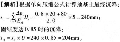 问题 场地为饱和淤泥质黏性土,厚5.0m,压缩模量ES为2.0MPa,重度为17.0kN/m3,淤泥质黏性土下为良好的地基土,地下水位埋深0.50m。现拟打设塑料排水板至淤泥质黏性土层底,然后分层铺设砂垫层,砂垫层厚度0.80m,重度20kN/m3,采用80kPa大面积真空预压3个月(预压时地下水位不变)。问固结度达85%时的沉降量最接近下列哪一选项?( ) A. 15cm B. 20cm C. 25cm D. 10cm