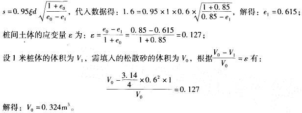 某松散砂土地基e0=0.85;emax=0.90; emin=0.55;采用挤密砂桩加固,砂桩采用正三角形布置。间距s=1. 6m,孔径d=0.6m,桩孔...