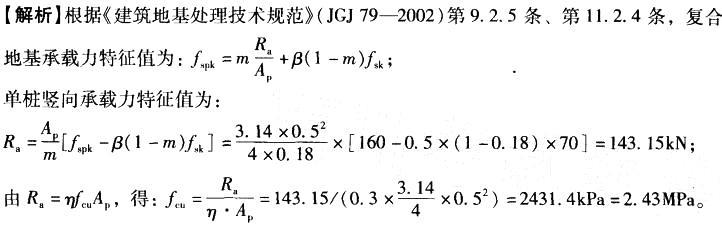 问题 采用水泥土搅拌桩加固地基,桩径取d=0.5m,等边三角形布置,复合地基置换率m= 0.18。桩间土承载力特征值fak =70kPa,桩间土承载力折减系数β=0.50,现要求复合地基承载力特征值达到160kPa,问水泥土抗压强度平均值fcu(90天龄期的折减系数η=0.3)达到( )MPa才能满足要求。 A. 2. 03 B. 2. 23 C. 2.43 D. 2.63