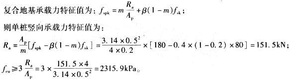 问题 某工程场地为软土地基,采用CFG桩复合地基处理,桩径d=5m,按正三角形布桩,桩距s=1.1m,桩长l= 15m,要求复合地基承载力特征值fspk=180kPa,单桩承载力特征值Ra及加固土试块立方体抗压强度平均值fcu应为( )。(取置换率m =0. 2,桩间土承载力特征值fsk =80kPa,折减系数;β=0.4) A. Ra = 151kPa; fcu =3210kPa B. Ra = 15kPa; fcu =2370kPa C. Ra= 159kPa; fcu=2430kPa D. Ra = 163kPa; fcu =2490kPa