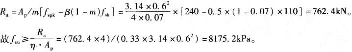 问题 已知软塑黏性土场地采用高压喷射注浆法处理,正方形布桩,桩径为0.6m,桩长为 12m,桩间距为2.0m,由桩周土的强度确定向单桩承载力为800kN,桩间去承载力特征值为110kPa,折减系数为0.5,要求复合地基承载力不小于240kPa,桩身强度fcu不宜小于( )MPa。 A. 5.2 B. 6.2 C. 7.2 D. 8.2