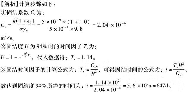 问题 黏土层(不透水面)上有厚度为10m的饱和高压缩性土层,土的特性指标如图5 -8所示。如果采用堆载预压固结法进行地基加固,固结度达到94%所需要的时间最接近于 ( )d。 A. 15 B. 200 C. 647 D. 800