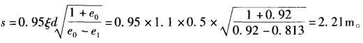 解析 根据《建筑地基处理技术规范》(JGJ 79-2002)第8. 2. 2条, 相对密实度达到0. 7时的孔隙比e1为: e1=emax-Dr1(emax-emin)=0. 96-0. 7×(0. 96 -0. 75) =0.813; 等边三角形布桩,桩间距为: