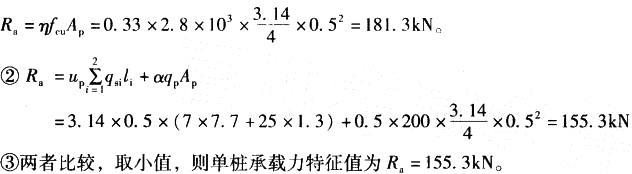 问题 某建筑采用筏形基础底面尺寸为10m×20m,底面压力为220kPa,基础底面下设300mm褥垫层,基础埋深2.0m,勘察资料如下: I.0~10m,淤泥质土,y = 19.5kN/m3, qsk =7kPa, fak =80kPa, Es =8. 8MPa; II.10~20m,砂土,y= 18.5kN/in3, qsk=25kPa,fak =200kPa; III.地下水埋深2.0m。 采用深层搅拌法处理,桩按等边三角形布置,桩径为500mm,桩长9m,水泥掺入比为15% ,桩体平均强度fcu=2.8MPa,桩间土承载力折减系数为0.4,桩端天然地基土承载力折减系数0.5,桩身强度折减系数为0.33,按《建筑地基处理技术规范》(JGJ 79— 2002)计算。 (2)单桩承载力特征值宜为( )kN。 A. 145 B. 155 C. 168 D. 181
