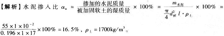 问题 某工程采用水泥土搅拌法加固,桩径为500mm,水泥用量为55kg/m,土的湿重度为 17.0kN/m3,则: (1)该工程的水泥掺入比最接近( )。 A. 14. 5% B. 15.5% C. 16.5% D. 17.5%