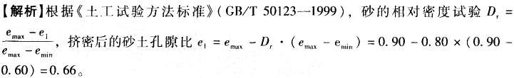 问题 某松散砂土地基,处理前现场测得砂土孔隙比为0.81,土工试验测得砂土的最大、最小孔隙比分别为0.90和0.60。现拟采用砂石桩法,要求挤密后砂土地基达到的相对密实度为0.80。砂石桩的桩径为0.70m,等边三角形布置。 (1)处理后地基的孔隙比最接近( )。 A. 0.60 B. 0.62 C. 0.64 D. 0.66