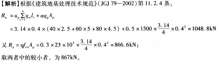 问题 某场地地层资料如表5-3所示,拟采用水泥土搅拌桩,桩径为0.4m,桩长12m,基础埋深2.0m,基础下设0.5m厚碎石垫层,桩端天然地基土承载力折减系数为0.5,桩体材料90天龄期抗压强度平均值为23MPa,桩身强度折减系数为0.3,单桩承载力宜取()kN。 A. 867 B. 905 C. 987 D. 1050