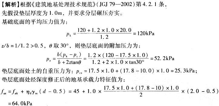 解析 pz + pcz = 52. 2 + 25. 3 = 77. 5kPa>64kPa。 以上说明设计的垫层厚度不够,再重新设计垫层厚度为1.7m,同理可得: pz + pcz = 38. 9 + 30. 8 = 69. 7kPa<77. 1 kPa。 满足设计的垫层厚度要求,故垫层厚度取1.7m。