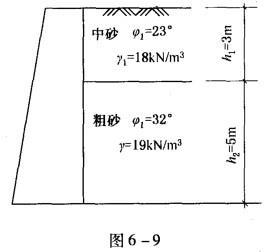 如图6-9所示的挡土墙,墙背竖直光滑,墙后填土水平,上层填3m厚的中砂,重度为18kN/m3,内摩擦角28°;下层填5m厚的粗砂,重度为19kN/m3,内...
