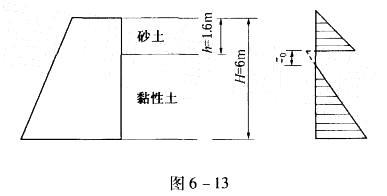 如图6-13所示挡土墙,墙高H=6m。墙后砂土厚度h=1.6m,已知砂土的重度为17.5kN/m3,内摩擦角为30°,黏聚力为零。墙后黏性土的重度为18....