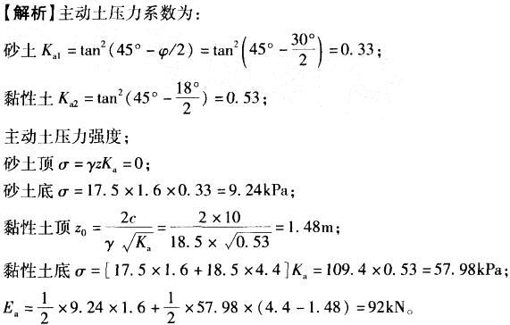 问题 如图6-13所示挡土墙,墙高H=6m。墙后砂土厚度h=1.6m,已知砂土的重度为17.5kN/m3,内摩擦角为30°,黏聚力为零。墙后黏性土的重度为18. 5kN/m3,内摩擦角为18°,黏聚力为10kPa。按朗肯主动土压理论,试问作用于每延米墙背的总主动土压力Ea最接近下列哪个选项的数值?( ) A. 82kN B. 92kN C. 102kN D. 112kN