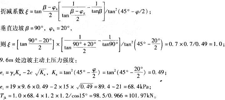 解析 根据《建筑基坑支护技术规程》(JGJ 120—1999),单根土钉轴间受抗荷载Tjk: Tjk=ξeiSxSy/cosα 式中,ξ——折减系数; ei——第i根土钉处基坑主动土压力; Sx, Sy——土钉横向、竖向间距; α——土钉与水平面的夹角。