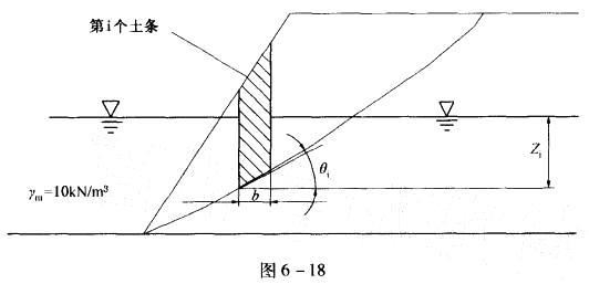 某土石坝坝址区设计烈度为8度,土石坝设计高度30m。计算简图如图6-18所示,采用瑞典圆弧法计算上游坝坡的抗震稳定性,其中第i个滑动条块的宽度b=3.2m...
